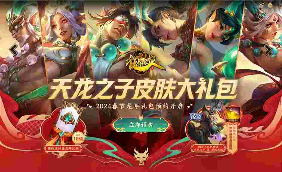 龙年限定 天龙之子大礼包预售开启。购买大礼包赠珍稀臻彩 天龙之子 易 云起龙骧,预售将额外赠“泼天富贵”图标。同时,春节(2024)通行证也将开启预售,购买预售通行证将直升10级。